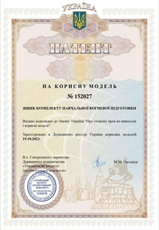 1. Патент на полезную модель № 152027 от 19.10.2022 г.;