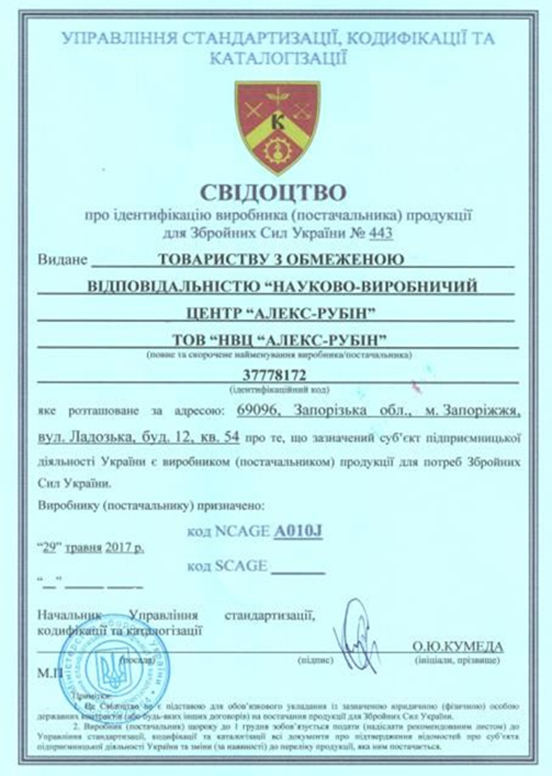 4. Свидетельство об идентификации производителя (поставщика) продукции для Вооруженных Сил Украины № 433 от 29.05.2017;